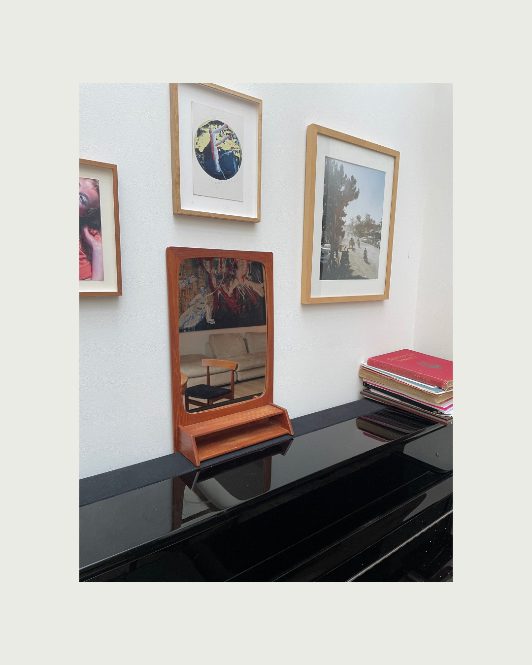 This exquisite small Danish teak mirror from the 1960s embodies the timeless elegance and craftsmanship characteristic of mid-century Scandinavian design. Crafted from warm teak wood, it features a compact shelf that adds both functionality and charm, perfect for displaying small items or essentials. The mirror surface shows minimal signs of age with only slight stains, while the back displays natural discoloration consistent with its vintage origin. Its understated design and quality materials make it a versatile piece that complements a variety of interiors, offering both practical use and authentic Danish heritage.